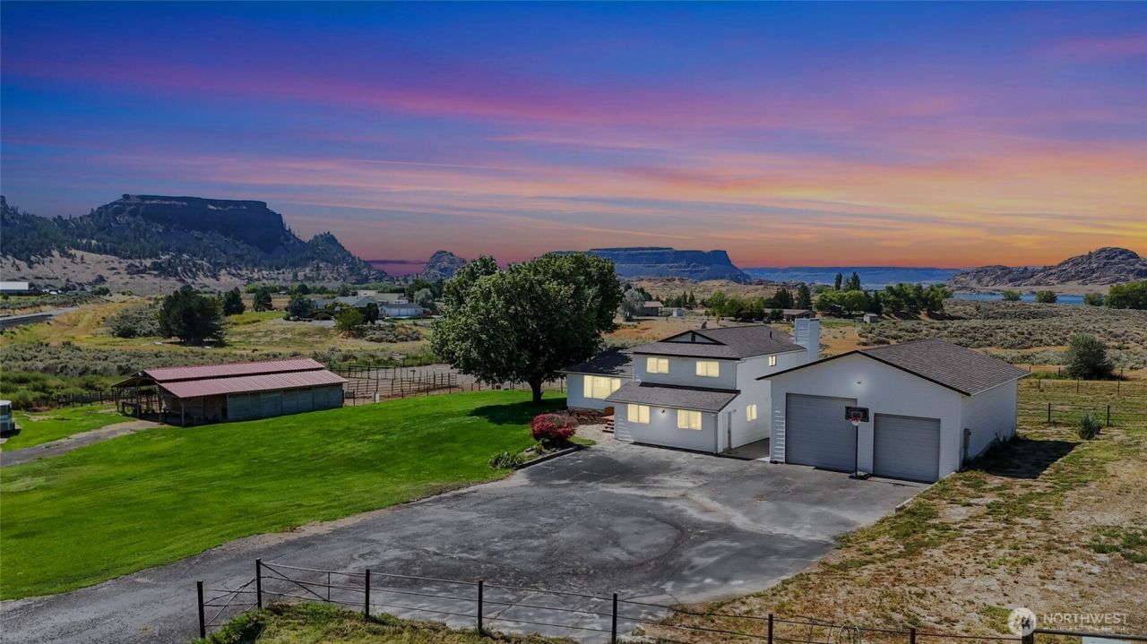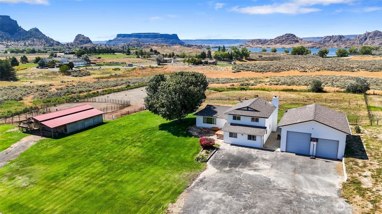 Welcome to the Country living you've been waiting for! Nestled on almost 3 irrigated acres, this 3 bedroom, 3 bath home offers sweeping views of iconic Steamboat Rock and all the space you need for country living. Perfectly set up for horses and livestock, the property features an outdoor riding arena, a barn with 5 stalls, and a 1,200 sq. ft. shop that provides plenty of space for projects, storage, or equipment. The fully irrigated grounds make maintaining lush pastures or landscaping a breeze. Inside, the home offers comfortable living with natural light and an open floor plan. Whether youre an equestrian enthusiast, hobby farmer, or simply looking for wide open spaces with stunning views and sunsets, this property has it all.